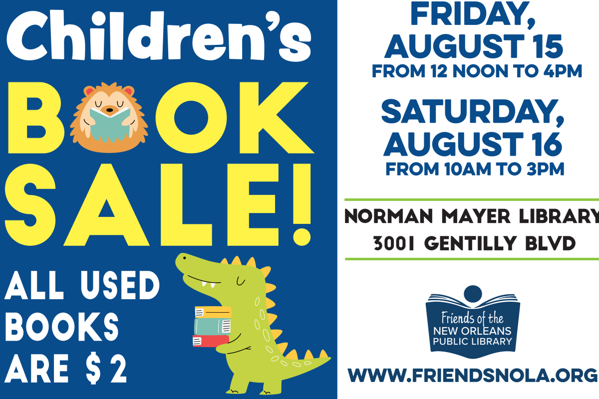 The Friends of the New Orleans Public Library is holding its first-ever all Children’s used book sale at the Norman Mayer Library branch in Gentilly. The two-day sale will be held on Friday, August 15 from noon to 4pm and Saturday, August 16 from 10am to 3pm. The sale is open to the general public on both days. Cash, cards, and Venmo are accepted